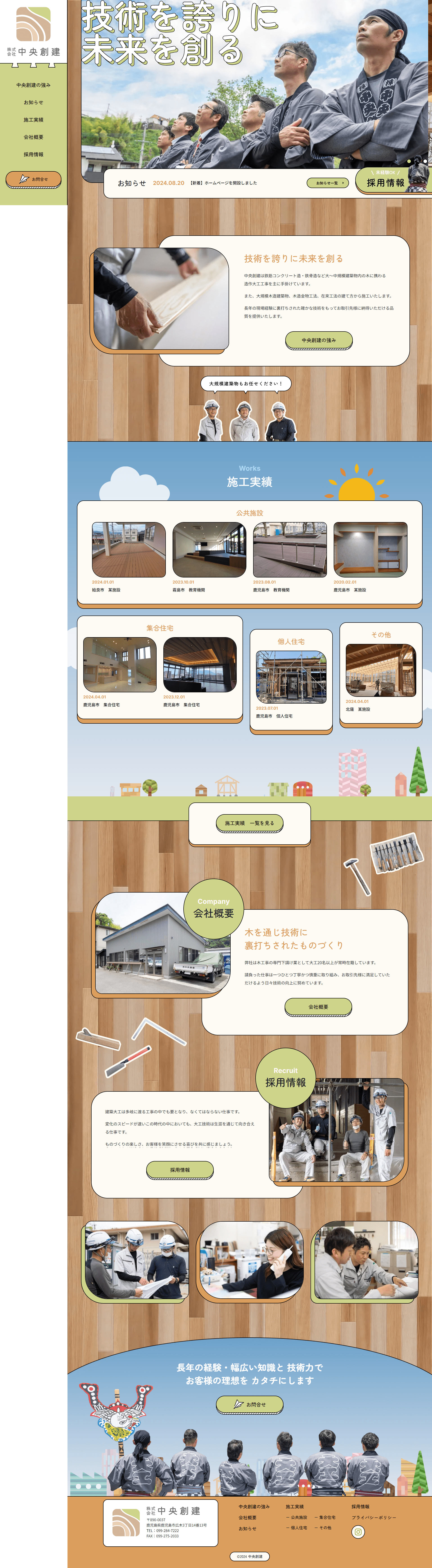 『株式会社中央創建』様のホームページを制作いたしました。 鹿児島の建築工事業、内装仕上工事業、大工工事業なら中央創建にお任せください。 公共施設、病院、集合住宅、個人住宅などの外壁・屋根・床・天井の下地組や和室の制作、 化粧木材の加工取り付けなど、伝統的な木組み技術から最新の建築技術で、幅広い知識と技術力を提供いたします。